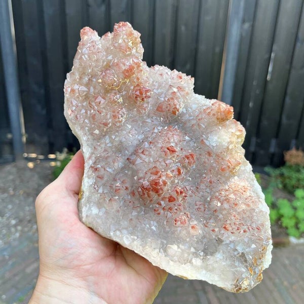ES: Pieza de grandes dimensiones con preciosos pequeños cristales de cuarzo parcialmente recubiertos de hematites procedente de Marruecos. Recibirás exactamente esta pieza como en la imagen.