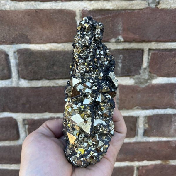 ES: Preciosa pieza de Pirita con cristales octaédricos de Pirita cubiertos en algunos puntos de Esfalerita, lo que la convierte en una preciosa composición. Máxima calidad, por supuesto de la mina Huanzala en Huallanca Perú. Recibirás exactamente esta pieza como se muestra en la foto.