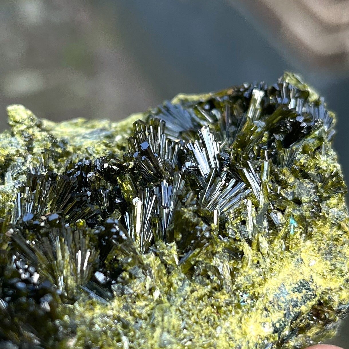 DU: Wunderschöner grüner Epidot von Casterner de les Olles in Spanien. Die Epidotstäbe dieser Stelle stehen oft aufrecht nebeneinander, in diesem Abschnitt sind sie jedoch schön aufgefächert. Sie erhalten genau dieses Stück wie auf dem Foto abgebildet.