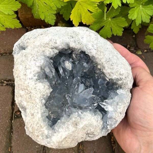 FR: Grande géode célestite avec de beaux cristaux longs et pointus de belle qualité dans la couleur bleu clair bien connue. Cette belle pièce provient du célèbre site voisin du village côtier de Katsepy à Madagascar. Vous recevrez exactement cette pièce comme indiqué sur la photo.
