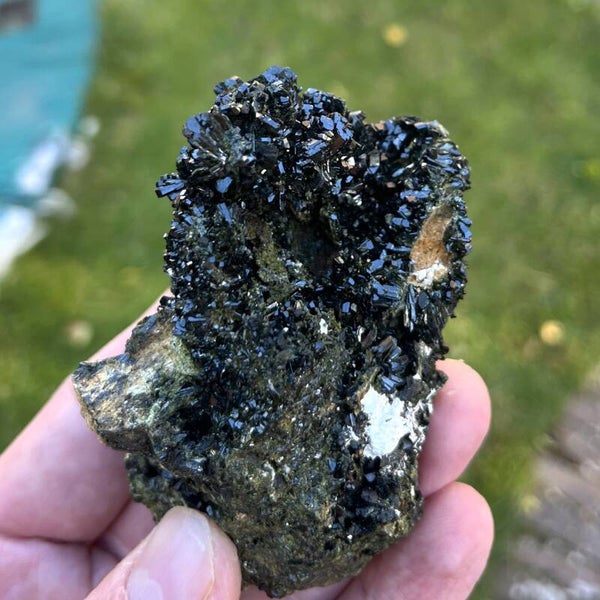 NL: De bergen rondom Yuksekova Hakkari in Turkije staan bekend om zijn prachtige mos-epidoten vaak vergezeld met kwarts. Wat de meesten niet weten is dat ook deze epidoten die donkergroen tot tegen het zwart aan gekleurd zijn en zeer aparte en bijzondere kristalvorming hebben, hier ook vandaan komen. Door de vele facetjes op de kleine kristallen geeft de epidoot bij draaiing schitterende glinstering. Voor de Epidootverzamelaars een must-have!! Je krijgt precies dit stuk zoals op de foto.