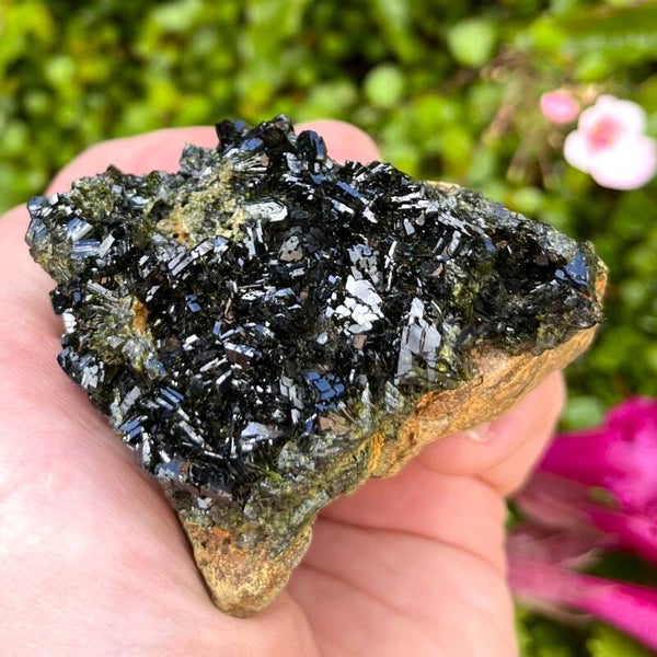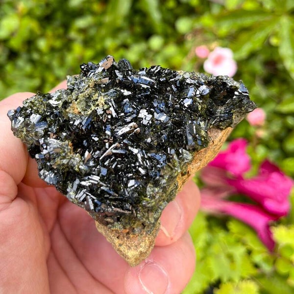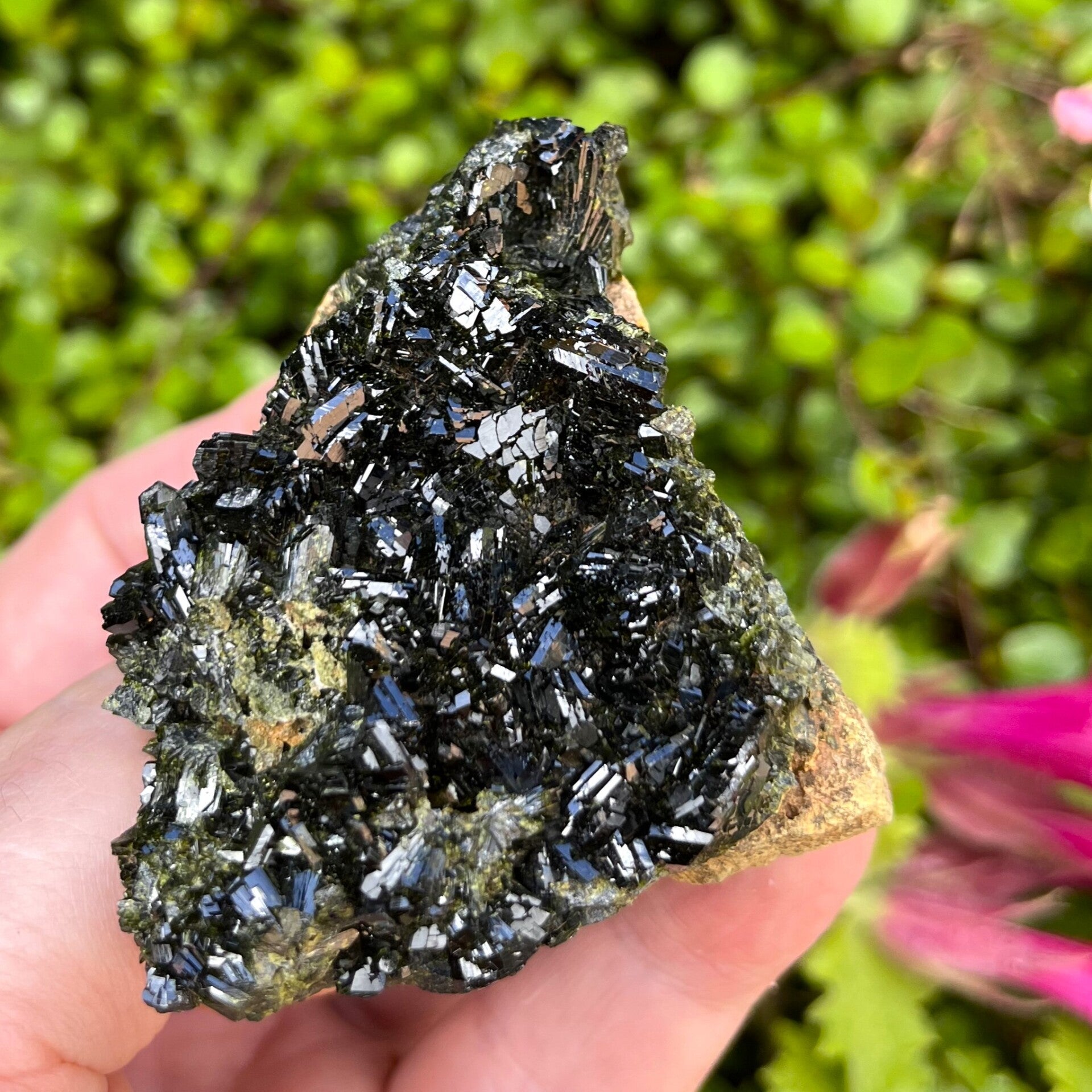 NL: De bergen rondom Yuksekova Hakkari in Turkije staan bekend om zijn prachtige mos-epidoten vaak vergezeld met kwarts. Wat de meesten niet weten is dat ook deze epidoten die donkergroen tot tegen het zwart aan gekleurd zijn en zeer aparte en bijzondere kristalvorming hebben, hier ook vandaan komen. Door de vele facetjes op de kleine kristallen geeft de epidoot bij draaiing schitterende glinstering. Voor de Epidootverzamelaars een must-have!! Je krijgt precies dit stuk zoals op de foto.