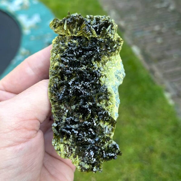 NL: Prachtige groene Epidoot uit Casterner de les Olles in Spanje. Vaak staan de epidootstaafjes van deze locatie rechtop naast elkaar, maar op dit stuk zijn ze deels prachtig gewaaierd. Je krijgt precies dit stuk zoals op de foto.