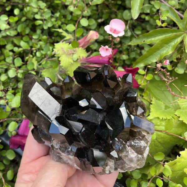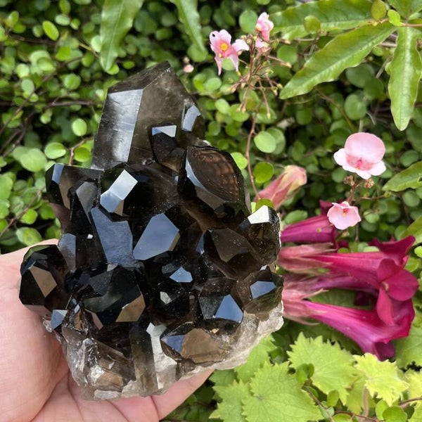 ES: Hermoso estilo Morion contra el robusto cuarzo ahumado negro de la provincia de Minas Gerais, Brasil. Las superficies de los cristales tienen un hermoso brillo, lo que hace que la pieza brille maravillosamente cuando la giras en la mano. Recibirás exactamente esta pieza como se muestra en la foto.