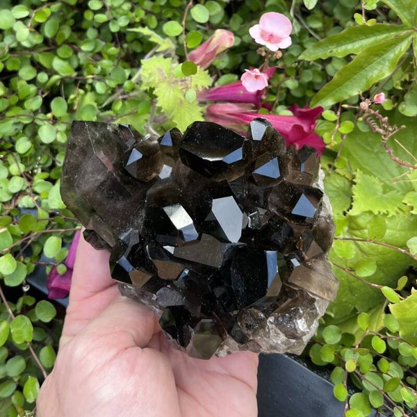 DU: Wunderschöner Morion-ähnlicher Kontrast zum schwarzen, robusten Rauchquarz aus der Provinz Minas Gerais, Brasilien. Die Oberflächen der Kristalle haben einen wunderschönen Glanz, sodass das Stück wunderschön funkelt, wenn Sie es in der Hand drehen. Sie erhalten genau dieses Stück wie auf dem Foto abgebildet.