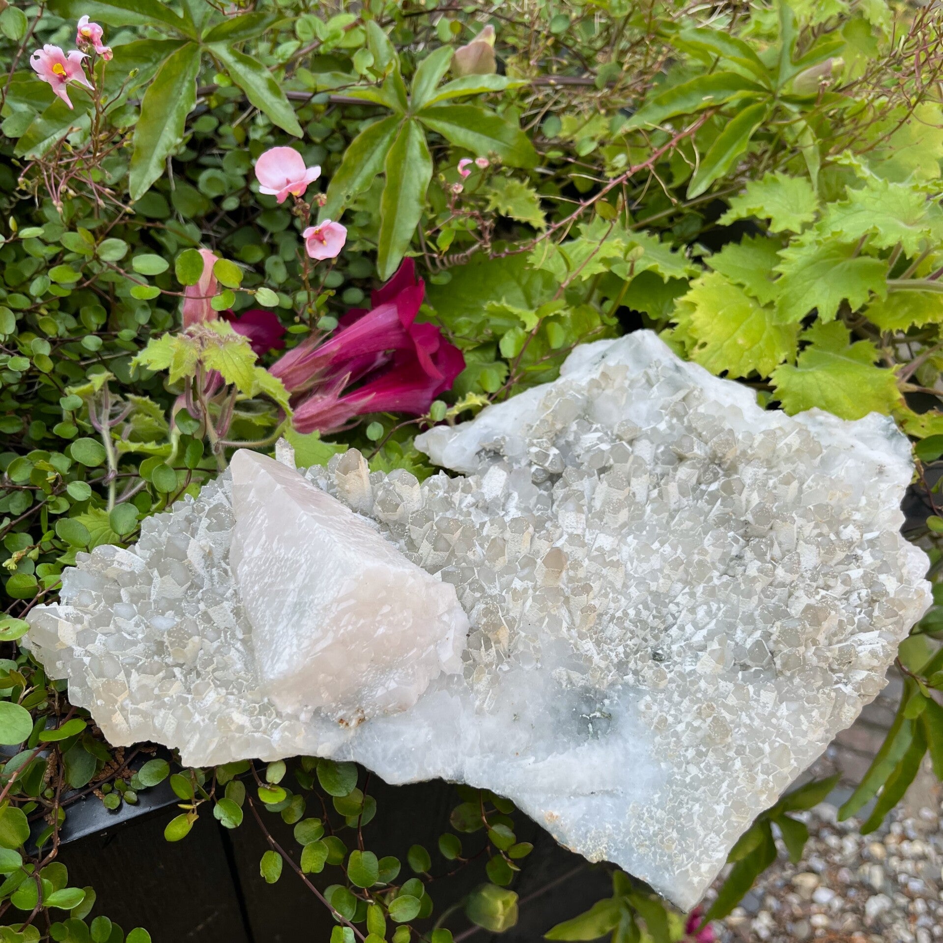 DU:Großes Stück mit unzähligen Quarzkristallen, alle mit weißer Basis. Es gibt auch ein vereinzeltes Stück Calcit auf der Matrix. Dieses wunderschöne Stück mit Charakter stammt aus Madan, Bulgarien. Sie erhalten genau dieses Stück wie auf dem Foto.