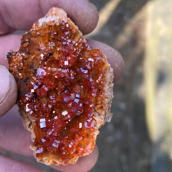 ES: Hermosa vanadinita de color rojo intenso pero también pequeña naranja brillante sobre un lecho de barita de color marrón-blanco, procedente de las minas y cuevas alrededor del pueblo de Mibladen en Marruecos. Alta calidad. Recibirás exactamente esta pieza como en la imagen.