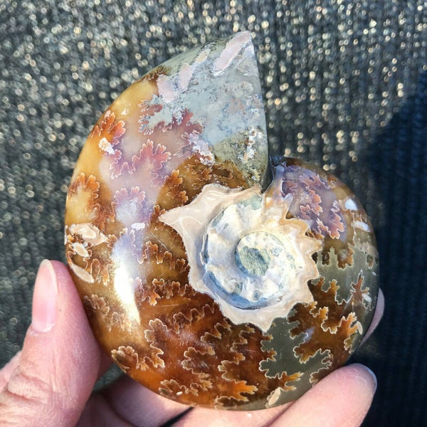 ES: Amonita bellamente pulida (cleoniceras) de Madagascar con un hermoso juego de colores. Obtendrá exactamente esta pieza como se muestra en la imagen.