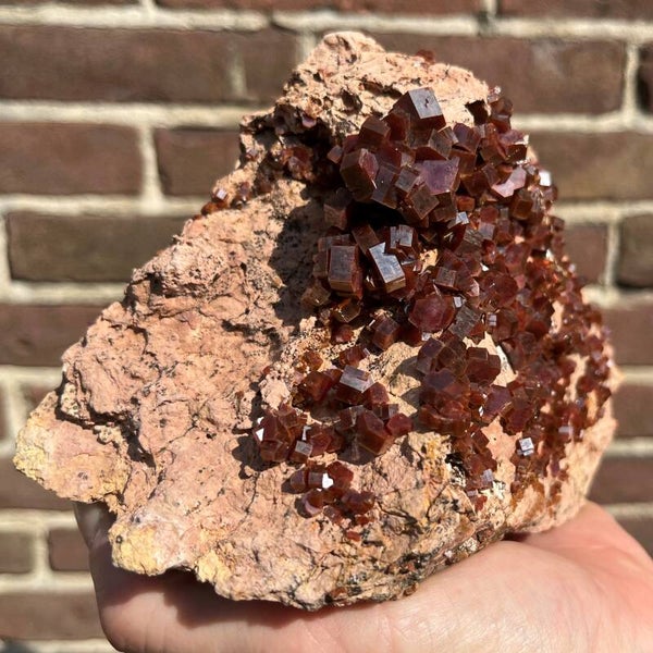 NL: Groot stuk Vanadiniet uit de mijnen en holen rondom het dorpje Mibladen in Marokko. Prachtige rood glinsterende Vanadinietkristallen. Mooi stuk. Zie ook beide video's. De ene video is in de schaduw opgenomen, de andere in de zon. Je krijgt precies dit stuk zoals op de foto.