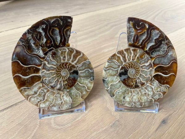 ES: Dos mitades de un gran Fósil de Amonita cortado y pulido de Madagascar. Obtendrá exactamente las dos piezas como en la imagen.
